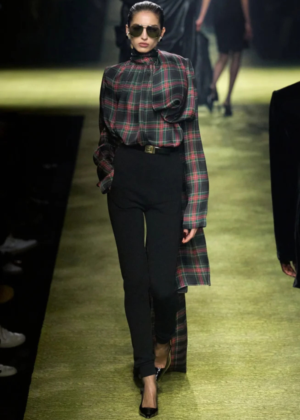 Não pense que a camisa xadrez não entra no corporate core. A Saint Laurent colocou na passarela combinações com saia lápis que vão tranquilamente pro escritório. Fórmula fácil para roubar já.